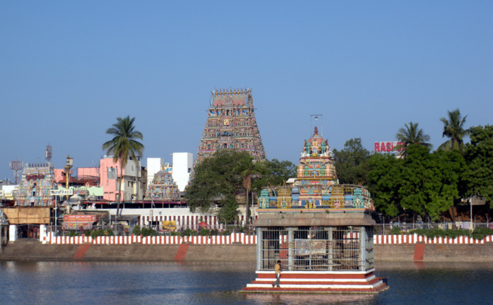 The Kapaleeshwarar Temple, dedicated to Lord Shiva, is located in Mylapore, Chennai, Tamil Nadu. Built around the 7th century CE, it is a fine example of South Indian architecture. The temple is named after "Kapala" (head) and "Ishvara" (Shiva). The legend states that Parvati, as a peahen, worshipped Shiva here, giving Mylapore its name. Shiva is worshipped as Kapaleeshwarar, and Parvati as Karpagambal, the goddess of the wish-fulfilling tree.