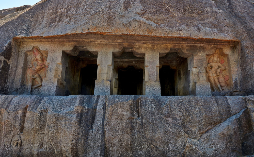 The temple’s facade and pillars showcase Pallava architectural innovation, with the temple carved on the northern face of a large rock overlooking a village irrigation tank. The deeply cut facade measures four feet at the bottom and two feet at the top. Two pillars and two pilasters on the inner side create the effect of four pillars, while asymmetrical recesses for guardian figures, or "dwara-palas," complete the outer facade. These pillars are of a massive square design, with octagonal divisions and quadrangular sections adding structural balance and symmetry.