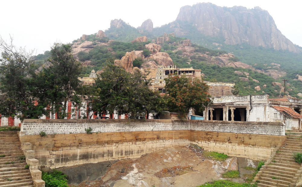 According to mythology, Piranmalai is said to be a fragment of Mount Meru, displaced during a conflict between Aadiseshan and Vaayu. This hill, shaped like a Sivalingam, is called Prachandragiri and Katoragiri. It’s believed that Bhrama, Saraswati, Subramanya, and Nandi worshipped Shiva here, and that Shiva revealed a vision of his marriage with Parvati to Agasthya Muni. Natural carvings on the hill depict this divine union of Lord Mangaibaagar (Shiva) and Goddess Thenammal (Parvati).