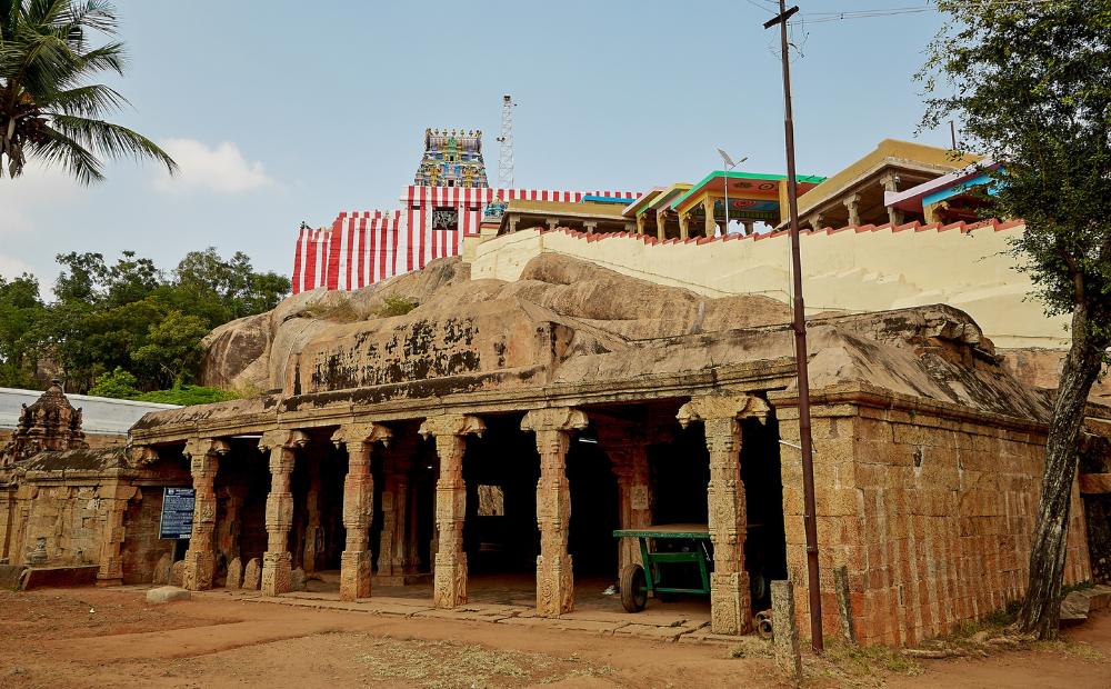 The temple features a grand five-tiered gopuram leading to a pillared hall and sanctum, with Murugan flanked by his consorts, Valli and Deivanai, both seated on peacocks. The temple stands on a 40-meter hill and covers 6.5 acres. Shrines dedicated to other deities surround the main sanctum. The three rock-cut caves at the hill's western side contain detailed carvings of Shiva and other deities, with two intricately decorated and the third plain.